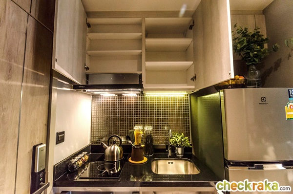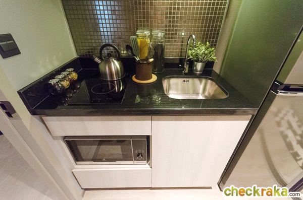 ได้เคาน์เตอร์ครัวขนาดใหญ่กว่าห้องที่แล้ว ห้องนี้ได้เป็นแบบครัวเปิด เหมาะกับการทำอาหารเบาๆ ที่กลิ่นไม่แรงมาก