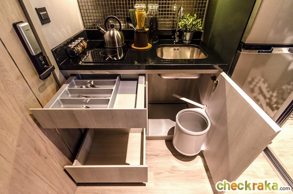 ใต้เคาน์เตอร์มีทั้งลิ้นชักเก็บช้อนส้อม ลิ้นชักเก็บของ และมีถังขยะมาให้ด้วย