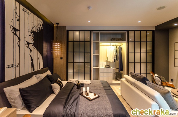 ห้องนี้มีความโดดเด่นตรงที่มีบานสไลด์ Hybrid Sliding Door เลื่อนปิดระหว่างห้องครัว ตู้เสื้อผ้า และห้องน้ำ