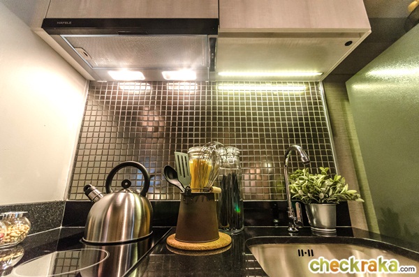 เครื่องดูดควันเป็นของ Hafele ที่เคาน์เตอร์ติดไฟราวมาให้ ช่วยเพิ่มแสงสว่างเวลาที่ทำอาหาร