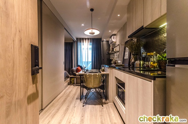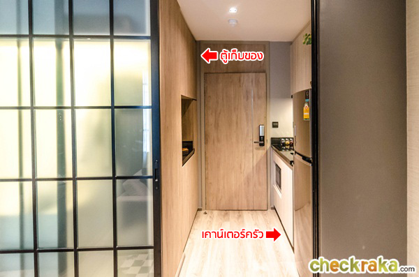 เข้ามาภายในห้องจะเจอกับโซนของห้องครัว จากภาพทางขวามือจะได้ชุดเคาน์เตอร์ครัว ส่วนทางซ้ายได้เป็นตู้เก็บของ