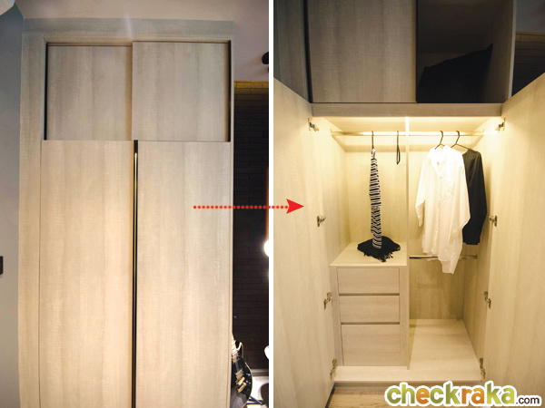 ภาพนี้เลื่อนเพื่อเปิดให้เห็นส่วนของตู้เสื้อผ้าที่สูงจรดฝ้า ขนาดไม่ใหญ่มากแต่แบ่งเป็นช่องเก็บของมาให้หลายช่อง