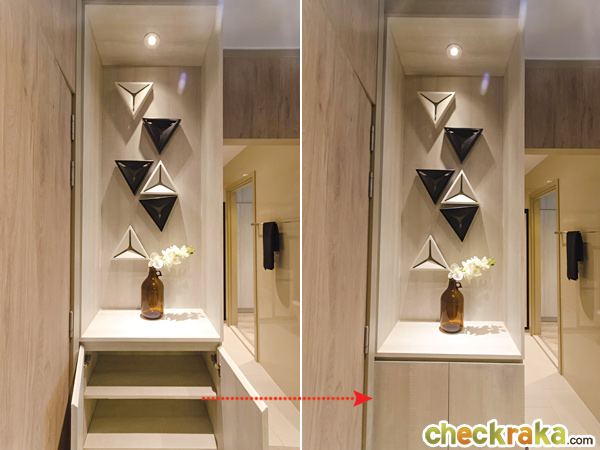 ฝั่งตรงข้ามเคาน์เตอร์ครัวทางโครงการ Built-in เป็นตู้สำหรับรองเท้า หรือเก็บของมาให้ สูงจรดฝ้า