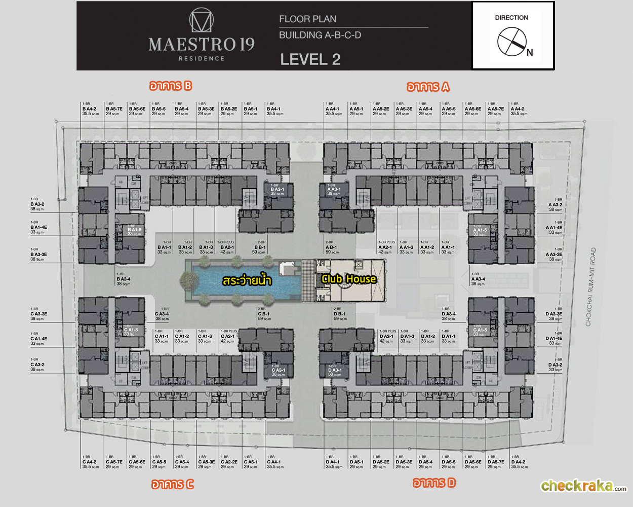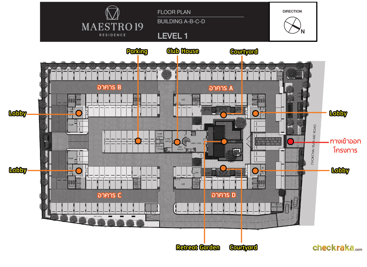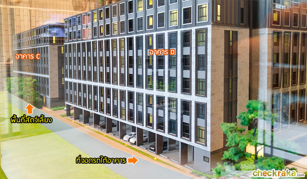 ส่วนอาคาร A และอาคาร D พื้นที่จอดรถจะอยู่ที่ชั้น 1 บริเวณใต้อาคาร