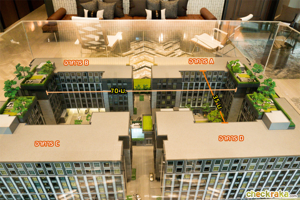 เนื่องจากทางโครงการค่อนข้างให้ความสำคัญกับความเป็นส่วนตัวของลูกบ้านดังนั้นจึงออกแบบให้แต่ละอาคารมีระยะค่อนข้างเยอะไม่ได้อยู่ในระยะประชิด โดยมีระยะห่างอยู่ที่ประมาณ 70 เมตร กับ 35 เมตร เป็นระยะที่ห่างพอสมควรทีเดียว