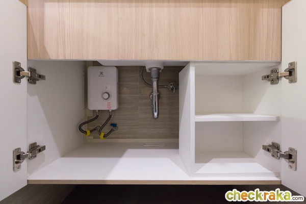ใต้อ่างล้างหน้ามีตู้เก็บของ ติดเครื่องทำน้ำร้อนมาให้เรียบร้อย