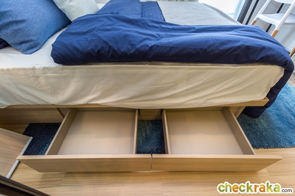 ปลายเตียงเป็นชั้นวางทีวี มีช่องเก็บของด้านล่าง