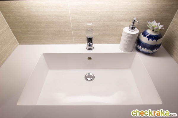 อ่างล้างหน้า Built-in สีขาว มีพื้นที่สำหรับวางอุปกรณ์อาบน้ำ ก๊อกน้ำแบบปรับน้ำร้อนน้ำเย็นได้
