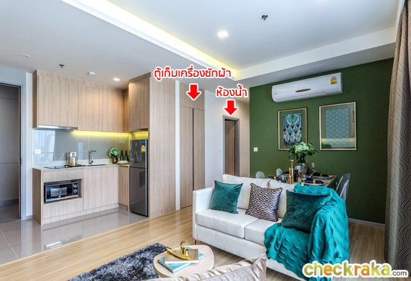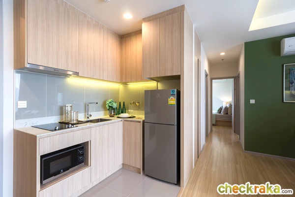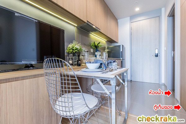 พื้นที่วางตู้เย็นอยู่ทางขวามือ ซึ่งตู้เย็นในห้องตัวอย่างมีขนาด 7.5 คิว