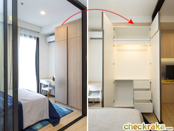 ติดกับโต๊ะมัลติฟังก์ชั่น จะเป็นตู้เสื้อผ้าบานเปิด ภายในตู้มีลิ้นชักเก็บของ