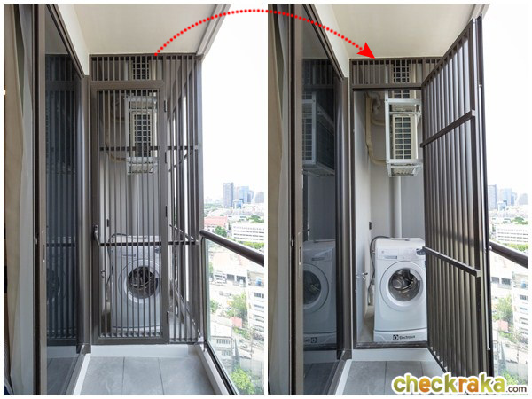คอมเพรสเซอร์แอร์ และเครื่องซักผ้าอยู่ด้านข้าง มีกริลปิดให้มิดชิดเป็นสัดส่วน