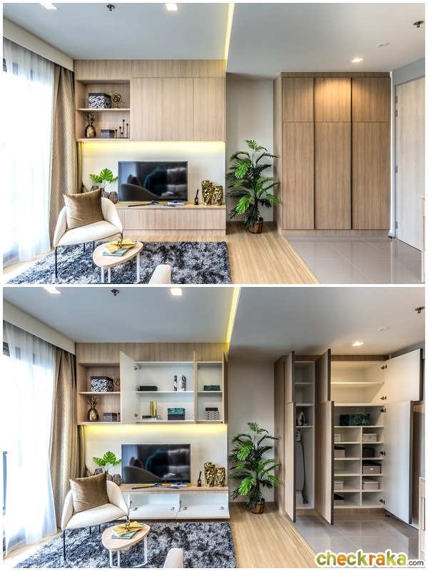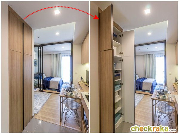ทางขวาหรือด้านหลังของประตูจะได้ตู้บานเปิดสูงจรดฝ้า สำหรับเก็บรองเท้าหรือเก็บของ