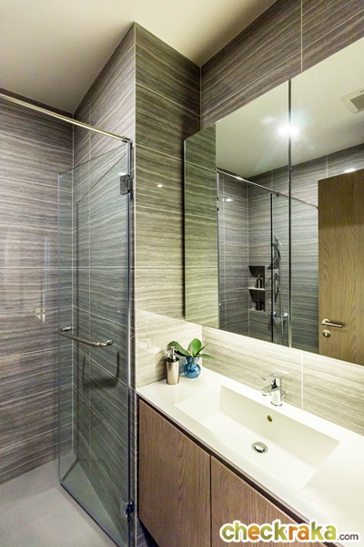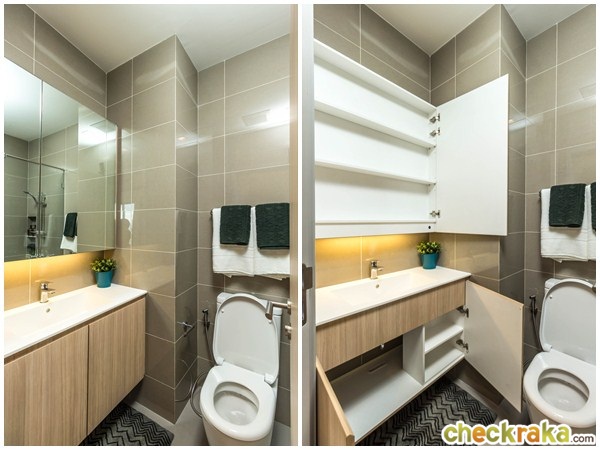 หน้าห้องน้ำได้ตู้ Built-in สูงจรดฝ้า สำหรับเก็บรองเท้า