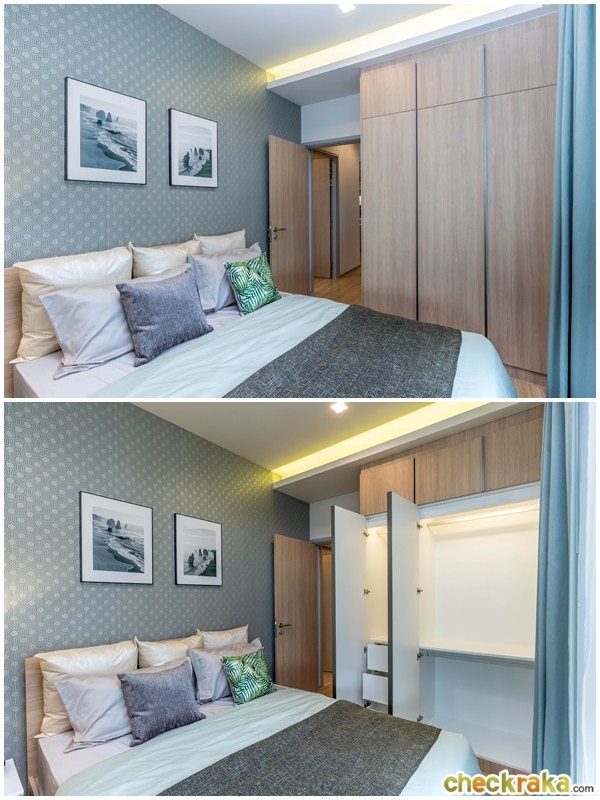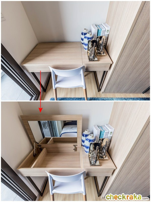 ติดกับตู้เสื้อผ้าได้โต๊ะมัลติฟังก์ชั่น สามารถเปิดขึ้นมาเป็นโต๊ะเครื่องแป้ง หรือจะปิดลงไปทำเป็นโต๊ะทำงานก็ได้