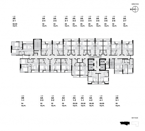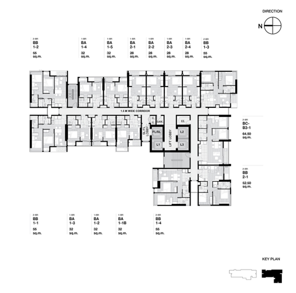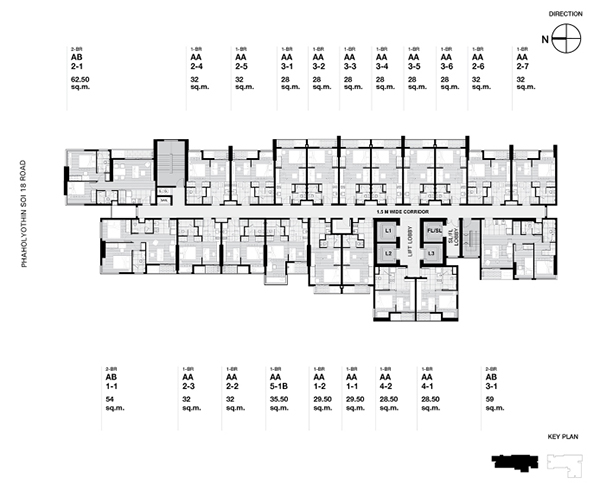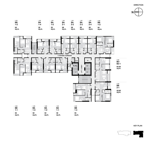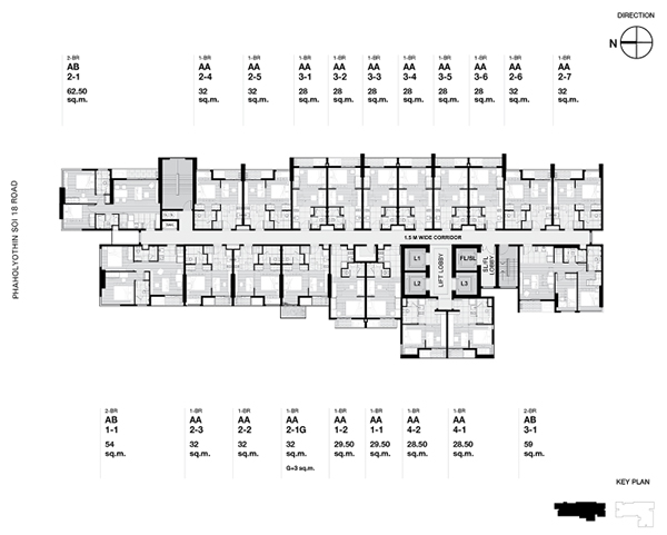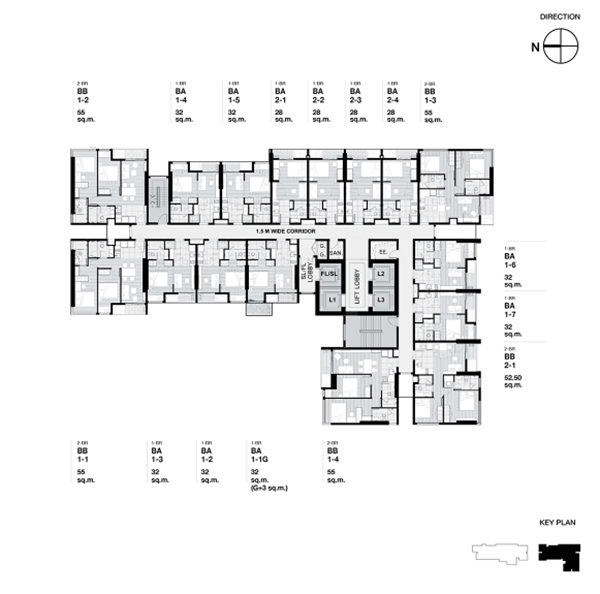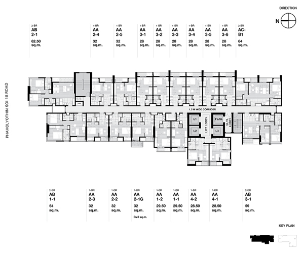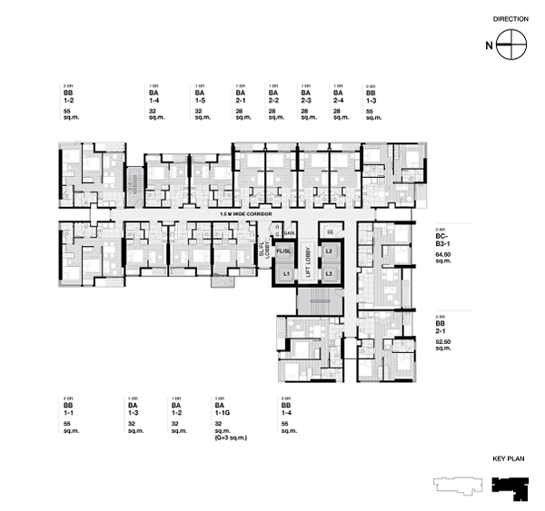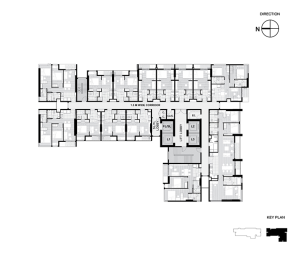 ชั้น 22-25, 28-31 : จะคล้ายกัน มีห้องพักอาศัยรวม 19 ยูนิต เป็นห้องแบบ 1 Bedroom 15 ยูนิต