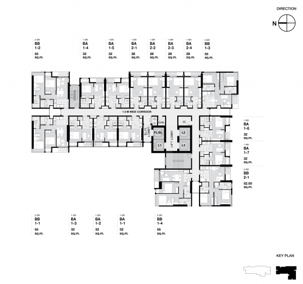 ชั้น 12-12A , 16-17 , 20-21 : จะเหมือนกัน มีห้องพักอาศัยรวม 20 ยูนิต เป็นห้องแบบ 1 Bedroom 17 ยูนิต