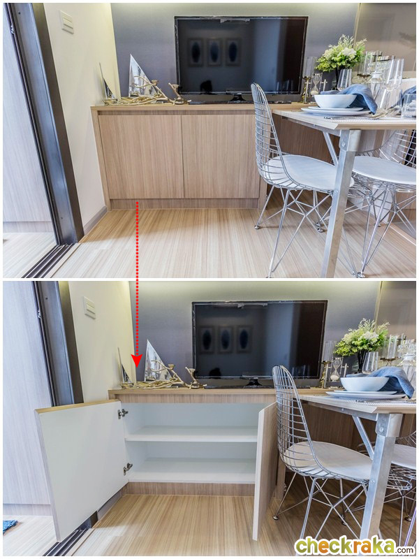 ด้านล่างของชั้นวางทีวีก็เป็นตู้สำหรับเก็บของได้อีกเช่นกัน เวลาเปิดระวังชนเก้าอี้ด้วยนะคะ