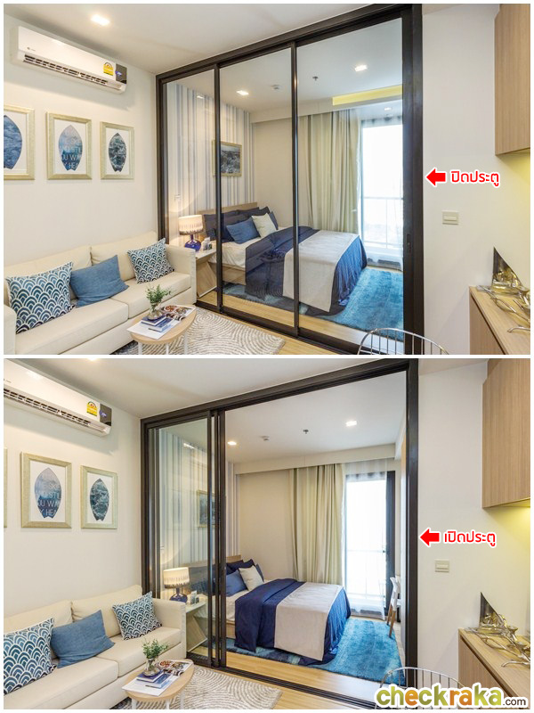 ห้องนอนกั้นด้วยประตูกระจกบานเลื่อน 3 ตอน ห้องน้ำ และตู้เสื้อผ้าอยู่ภายในห้องนอน