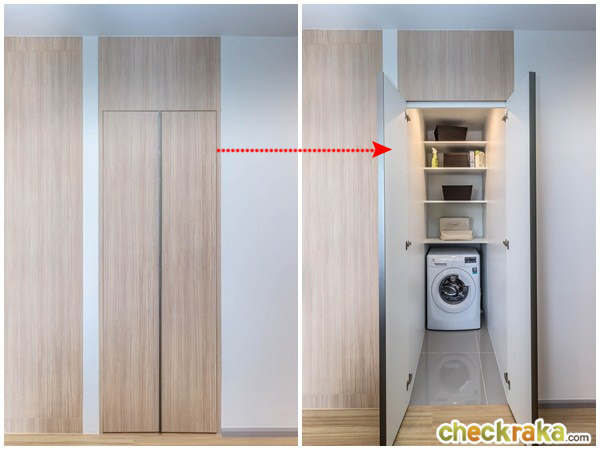 และมีช่องสำหรับเก็บอุปกรณ์ทำความสะอาดจำพวกไม้กวาด หรือไม้ถูพื้น ด้านบนเป็นตู้เก็บของแบบบานเปิด