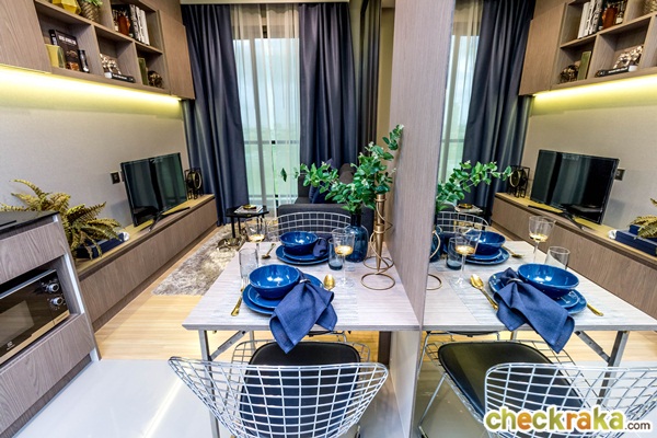 ด้านหลังโซฟาเป็นพื้นที่ทานอาหาร ได้โต๊ะทานอาหาร พร้อมชุดเก้าอี้ 4 ที่นั่ง