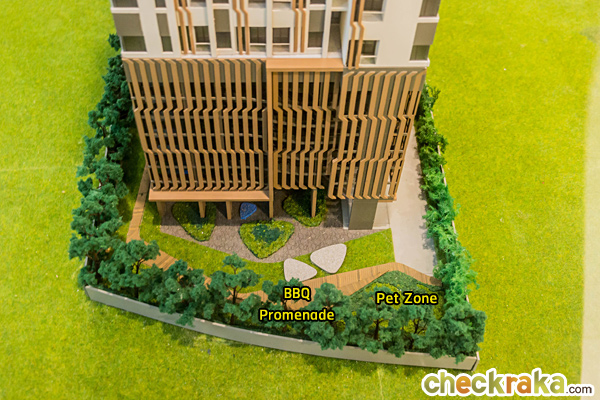 ลาน BBQ และพื้นที่ Pet Zone จะยู่ฝั่งทิศใต้ติดกับอาคาร B