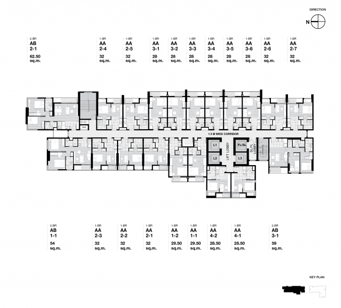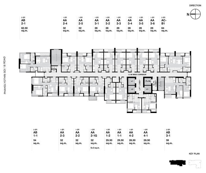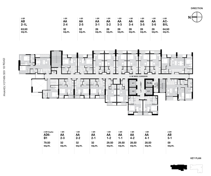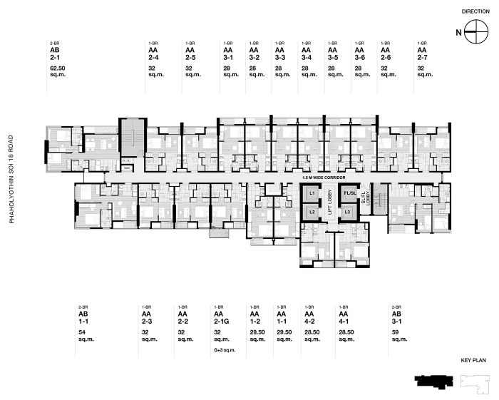 ชั้น 22-25, 28-31 : จะคล้ายกัน มีห้องพักอาศัยรวม 19 ยูนิต เป็นห้องแบบ 1 Bedroom 15 ยูนิต