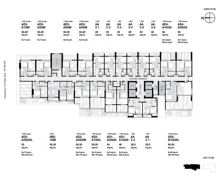 ที่เหลือจะเป็นห้องแบบ 1 Bedroom Duplex 11 ยูนิต และ 2 Bedroom Duplex อีก 2 ยูนิต