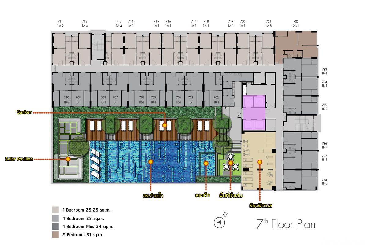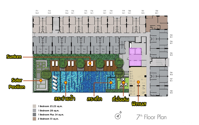 สิ่งอำนวยความสะดวกบนชั้น 7 มีประตูกั้นแยกส่วนระหว่างโซนพักอาศัยกับโซนสิ่งอำนวยความสะดวก