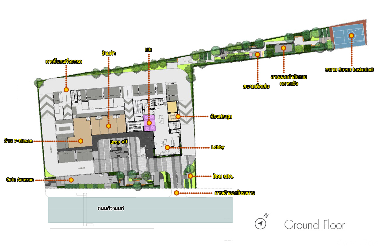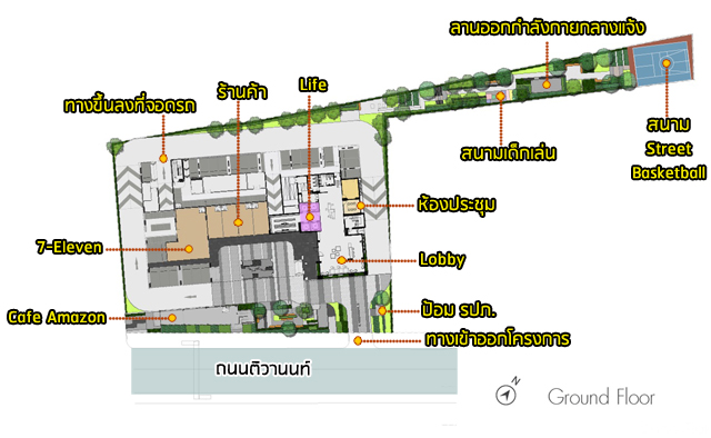 มีอาคารสูง 2 ชั้น ซึ่งเป็น ร้านกาแฟ Cafe Amazon แยกออกจากอาคารพักอาศัย นอกจากนี้บริเวณโซนด้านหลังยังมีสนามเด็กเล่น ลานออกกำลังกาย และสนาม Street Basketball