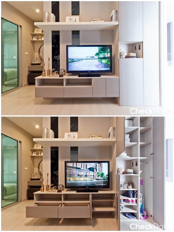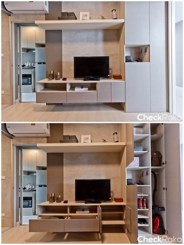 ฝั่งตรงข้ามเป็นชั้นวางทีวี และตู้เก็บของอเนกประสงค์