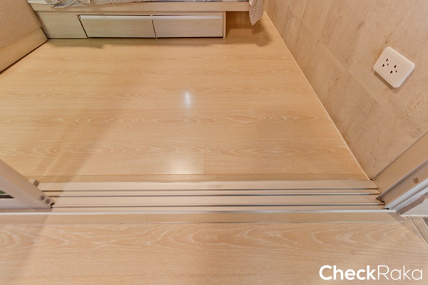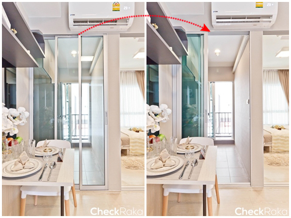 ประตูระเบียงวัสดุกระจกสีเขียวตัดแสงแบบบานเลื่อน 2 ตอน เปิดเพื่อช่วยระบายกลิ่นอาหาร และยังเป็นช่องแสงธรรมชาติทำให้ห้องครัวดูสว่างมากขึ้น ธรณียกขึ้นมาประมาณ 10 ซม.