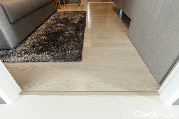 พื้นห้องครัวจบขอบด้วย PVC แบบเซาะร่องสีเทา