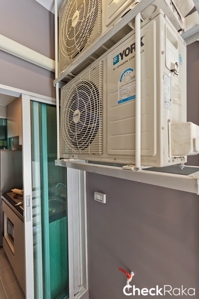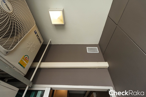 คอมเพรสเซอร์แอร์แขวนลอยชิดผนัง แนะนำให้ติดกริลเป่าลมร้อนออกด้านนอกอาคารจะช่วยให้ระเบียงไม่ร้อนมาก