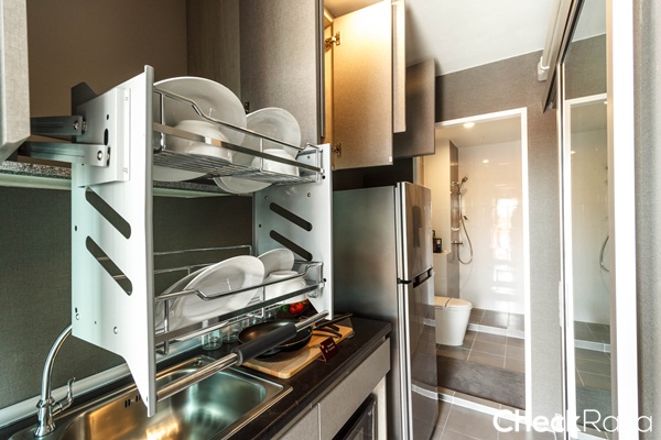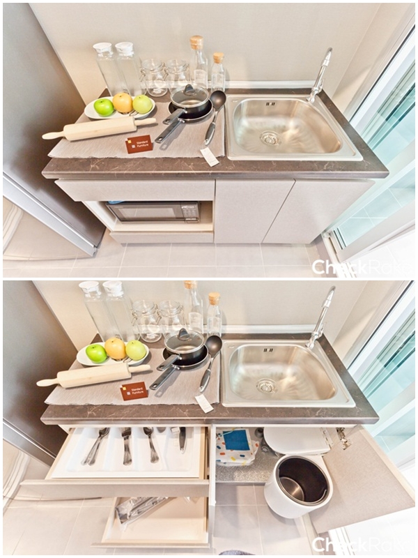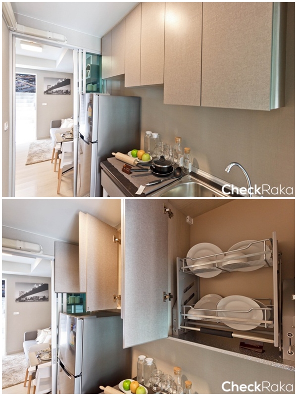 ตู้เก็บของด้านบนไม่ได้ติดตั้งเครื่องดูดควันมาให้แต่ว่าได้ชั้นเก็บจานมาแทน (อยู่ฝั่งขวาสุด)