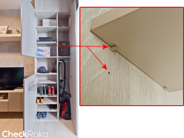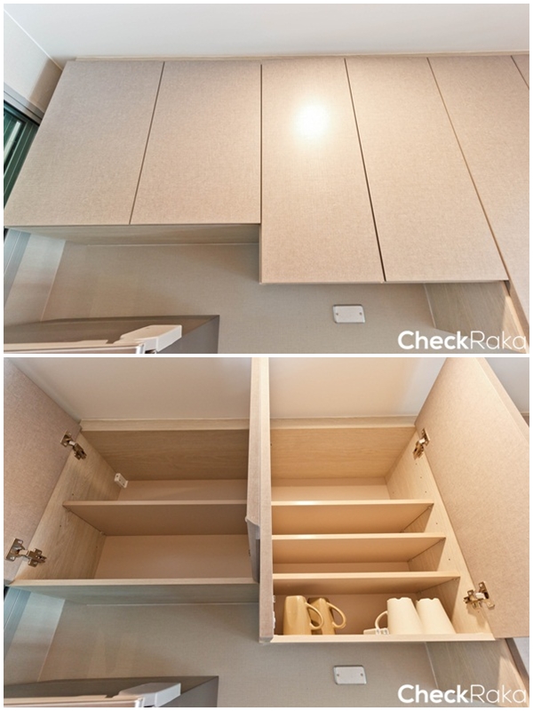 ส่วนตู้เก็บของฝั่งซ้ายสุดเป็นแบบบานเปิด และตู้บานตรงกลางเป็นแบบบานกดกระเด้ง ภายในตู้มีหน้าตาแบบนี้
