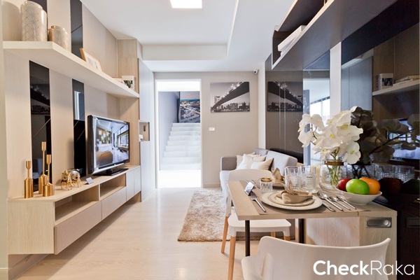 ได้โต๊ะทานข้าวอเนกประสงค์พร้อมเก้าอี้ 2 ตัว ตั้งอยู่ระหว่างโซฟากับห้องครัว