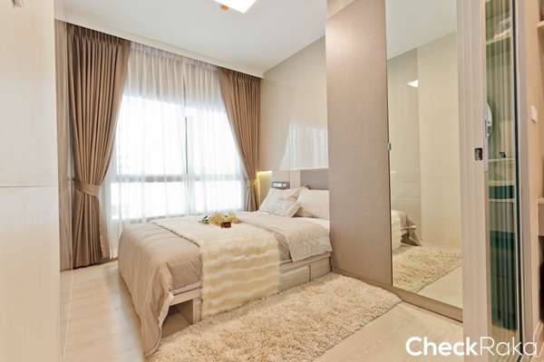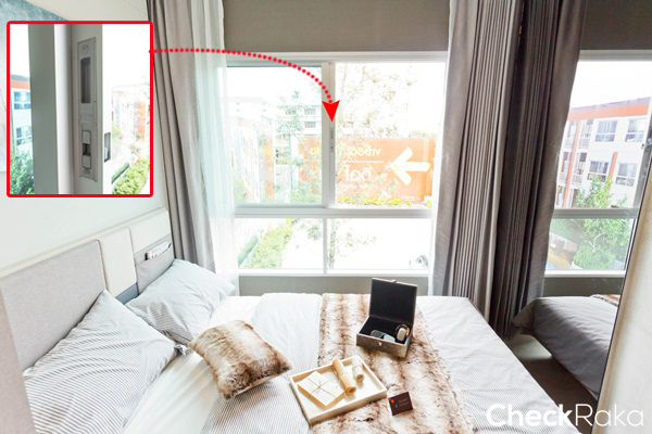 พื้นที่ห้องนอนดูกว้างกว่าห้องที่แล้ว วางเตียงไว้ชิดฝั่งหน้าต่าง ระยะปลายเตียงเหลือทางเดินประมาณ 50 ซม.