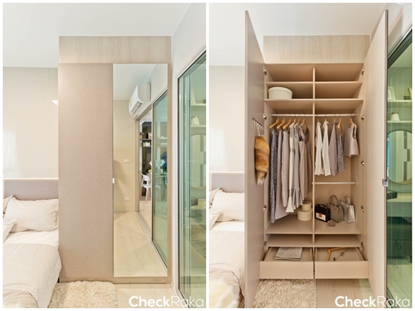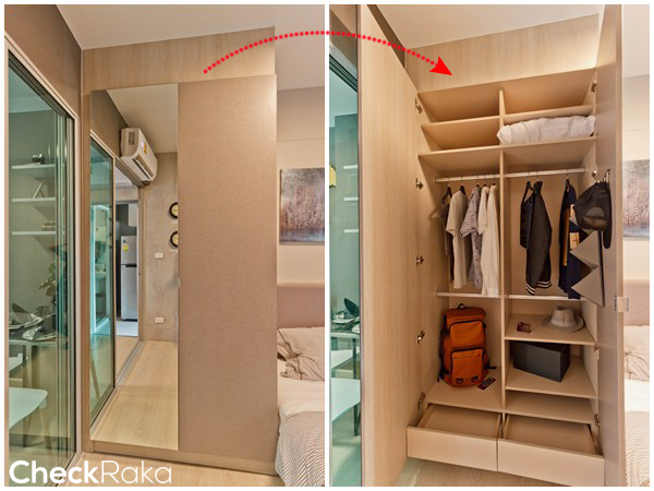 ตู้เสื้อผ้าได้กระจกบานใหญ่เต็มบาน (สาวๆ น่าจะชอบ) ลิ้นชักเยอะ ชั้นวางของภายในปรับเปลี่ยนระดับให้เหมาะกับการใช้งานได้เช่นกัน แล้วแต่ลูกบ้านเลยว่าอยากให้ช่องไหนกว้างหรือแคบ โดยที่โครงการมีอะไหล่ของตู้เสื้อผ้ามาให้ด้วย