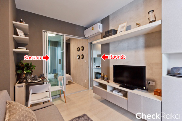 มุมนี้ถ่ายจากหน้าห้องครัวมองกลับไปยังประตูทางเข้าห้อง เพื่อให้เห็นภาพรวมของโซนห้องนั่งเล่น