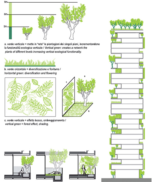 ความพิเศษของอาคารนี้คือ แนวคิดการอยู่ร่วมกันระหว่างมนุษย์กับธรรมชาติ ซึ่งระเบียงทุกๆ ห้องจะถูกออกแบบให้มีพื้นที่พิเศษสำหรับวางกระถางต้นไม้ เรียกว่ากลายเป็นการสร้างระบบนิเวศน์ย่อมๆ ในตึกเลยทีเดียว บรรดาต้นไม้หลากหลายพันธุ์ จะถูกคัดสรร และศึกษาธรรมชาติของพืชแต่ละชนิดว่าเหมาะสมที่จะปลูกในสภาวะแบบนี้หรือไม่ ต้องการสภาพอากาศแบบไหน แสงแดดมากน้อยเพียงใด ต้านทานลมแรงในชั้นสูงๆ ของตึกได้หรือไม่ เพราะความแรงของลมจะแตกต่างกันไปตามระดับความสูงของแต่ละชั้น โดยรวมแล้วตึกมีต้นไม้มากถึง 800 ต้น ไม้พุ่ม 5,000 ต้น และพืชคลุมดินอีกกว่า 14,000 ต้น