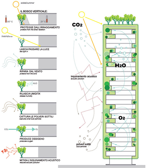 "Bosco Verticale (บอสโก เวอร์ติคาเล)" นอกจากจะเป็นอีกหนึ่งตัวช่วย เพิ่มพื้นที่สีเขียวให้กับมิลานแล้ว อีกหลายสิ่งสำคัญของอาคารที่ใครๆ ก็เรียกว่า "ป่าแนวตั้ง" นี้ คือการช่วยดูดซับก๊าซคาร์บอนไดออกไซด์ในอากาศ เพิ่มออกซิเจน ช่วยปรับอุณหภูมิภายในอาคาร เพื่อประหยัดพลังงานจากการใช้เครื่องปรับอากาศ อีกทั้งยัง เป็นเกราะป้องกันมลพิษ ซึ่งต้นไม้นอกอาคารนั้นจะเป็นตัวช่วยกรองอากาศก่อนเข้าสู่ห้องพักได้เป็นอย่างดี