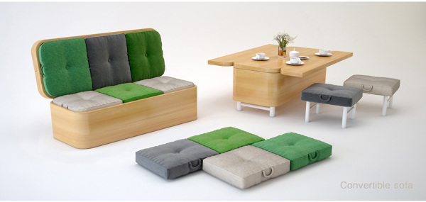 มองเผินๆ ดูเหมือนโซฟา แต่พอถอดไปถอดมาก็กลายเป็นโต๊ะเอามาใช้กินข้าวได้ แถมยังมีเก้าอี้เบาะให้สามารถใช้นั่งทานข้าวกันหลายๆ คนในหลายๆ มุมได้ด้วย (ออกแบบโดย Julia Kononenko)