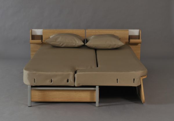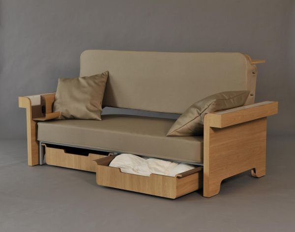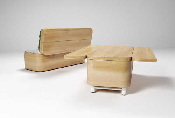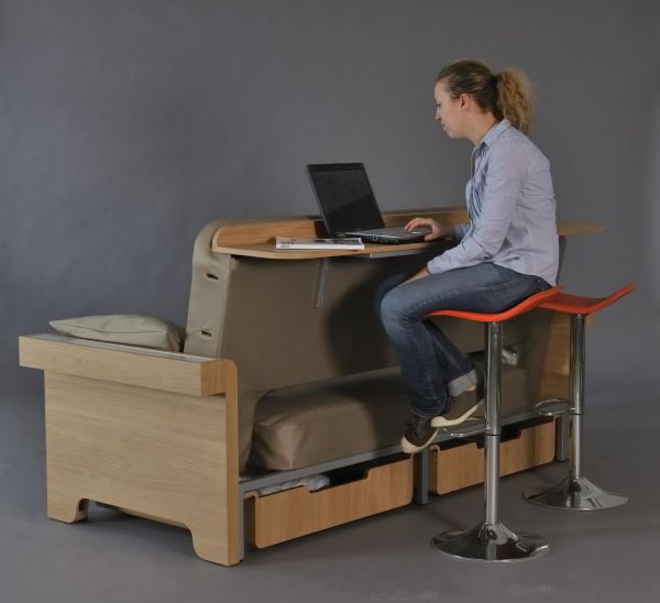 เฟอร์นิเจอร์ชุดนี้เป็นได้ทั้งโต๊ะทำงานแบบ Workstation เล็กๆ เป็นโซฟา และก็เป็นเตียงนอนได้ เหมาะกับห้องนั่งเล่นในบ้าน หรือคอนโดเล็กๆ เพราะสามารถปรับเป็นที่นอนได้เลยสำหรับแขกที่มาเยี่ยม (ออกแบบโดย Fanny Adams)
