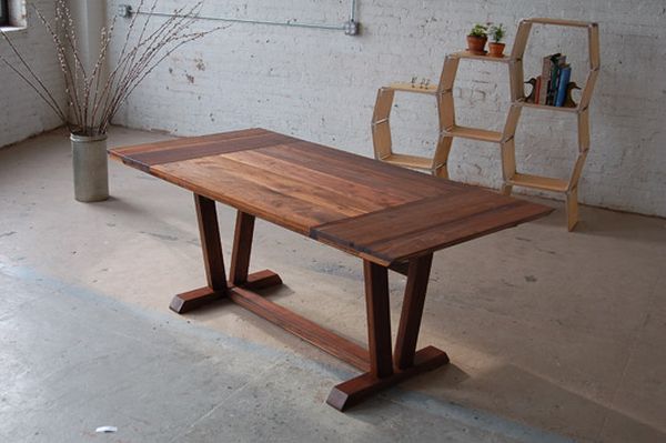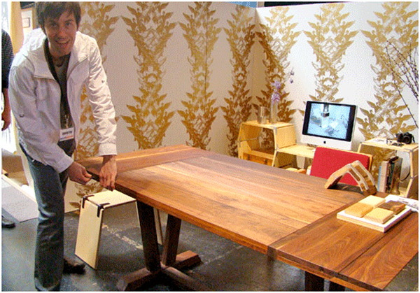 โต๊ะลายไม้ Walnut ตัวนี้เป็นทั้งโต๊ะ และโซฟา Loveseat เบาะจะซ่อนอยู่ใต้โต๊ะ พอเปิดแล้วดัน จากโต๊ะจะกลายเป็นโซฟาในทันที (ออกแบบโดย Ecosystems)