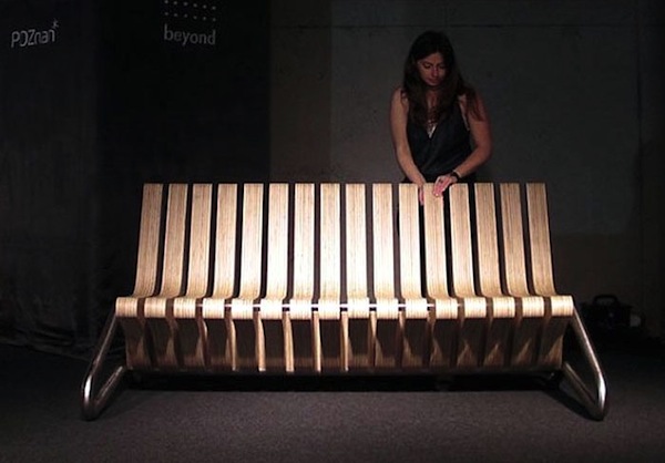ม้านั่งตัวนี้เป็นได้หลากหลายมาก แค่หมุนชิ้นที่นั่งไปมา ก็จะได้ทั้งม้านั่งยาว ม้านั่งสองที่นั่งพร้อมโต๊ะข้าง หรือม้านั่งสองที่นั่งพร้อมโต๊ะกลาง เป็นได้ทุกอย่างสมบูรณ์แบบเลยครับ (ออกแบบโดย Beyond Standards)