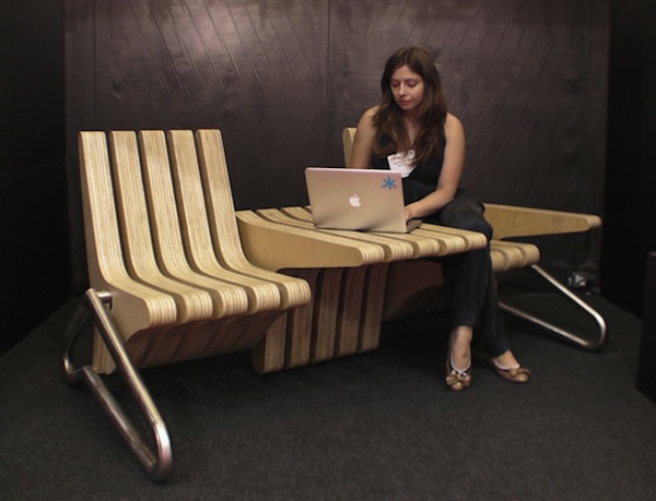 อาจจะดูแล้วงงนิดนะครับกับรูปเฟอร์นิเจอร์ชุดนี้ โดยหลักๆ แล้วทั้งหมดนี้ทำจากผ้าใบแบบยึดหยุ่น ไม้ และอะลูมิเนียมในบางส่วน วางพิงกับกำแพงนอกจากเป็นของตกแต่งแปลกตาแล้ว ยังสามารถนั่งได้ด้วย (ออกแบบโดย YOY)