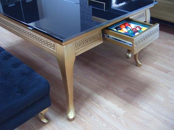 โต๊ะนี้ทำจากไม้ MDF ปิดด้วยทองคำเปลว เป็นได้ทั้งโต๊ะทานอาหาร และโต๊ะสนุกเกอร์ เป็นเฟอร์นิเจอร์ในบ้านที่เราสามารถเปลี่ยนบทบาทจากของใช้ เป็นของเล่นได้อย่างรวดเร็ว (ออกแบบโดย Koralturk)
