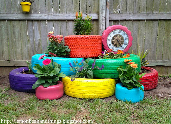 ยางรถยนต์ก็เป็นกระถางต้นไม้ได้นะคะ แต่อาจต้องใช้พื้นที่สักหน่อย ไม่ว่าจะเป็นยางไซส์เล็กหรือยางไซส์ใหญ่ เลือกตามใจชอบแล้วแต้มสีสันสวยๆ เติมดิน ปลูกต้นไม้สวยๆ ลงไปเลย