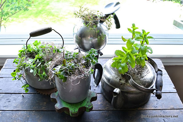 กาน้ำเก่าๆ อย่าทิ้งให้เปล่าประโยชน์ ใส่ดินปลูกผักเขียวๆ ตั้งไว้เพิ่มความเก๋ในครัวก็ได้ค่ะ