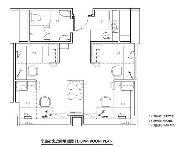 ตรงกลางระหว่างเตียงจะเป็นโต๊ะส่วนกลางที่เอาไว้นั่งกินข้าว นั่งเล่น นั่งคุยกันก็ได้ แต่ละเตียงจะมีผ้าม่านเอาไว้ปิดเพื่อเพิ่มความเป็นส่วนตัว
